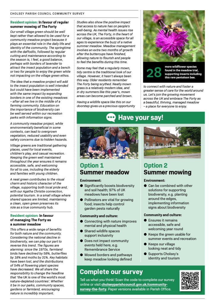 Community survey: The Forty’s management Cholsey Parish Council will be undertaking a community survey to help inform the future management of The Forty. The survey and supporting materials will be available here soon!